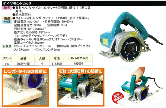 付属品:ダイヤモンドホイール105、給水装置(給水プラグ付)、スパナ2mm、ボックスレンチ9mm
